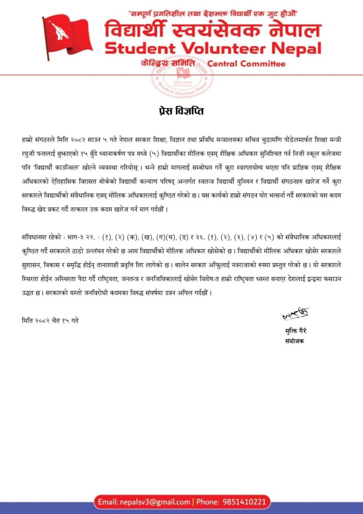काठमाडौं — विद्यार्थी स्वयंसेवक नेपालका केन्द्रीय संयोजक मुक्ति गैरेले सरकारले विद्यार्थीका मौलिक अधिकार कुण्ठित गरेको आरोप लगाएका छन्। उनले सरकारको सय कार्यसूचीअन्तर्गत विद्यार्थी संगठनहरू खारेज गर्ने निर्णयप्रति आपत्ति जनाउँदै यसले सुशासन होइन, तानाशाही प्रवृत्ति बढाएको बताएका छन्।