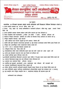 काठमाडौं — गौरव नेतृत्वमा बसेको नेपाल कम्युनिष्ट पार्टी (माओवादी) स्थायी कमिटीको सातौं बैठकले २२ बुँदे निर्णय सार्वजनिक गरेको छ।